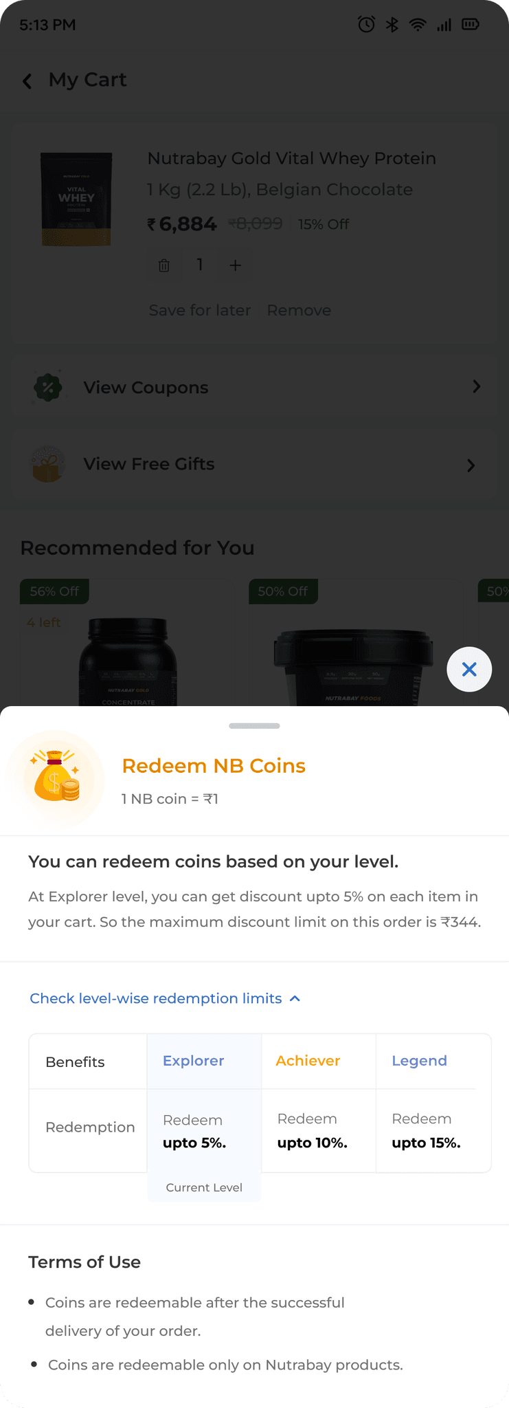 User has the cue to redeem their exisiting coins on the cart through a check box right above the price details. This placement of the widget seems contexually correct and one which user won't miss.